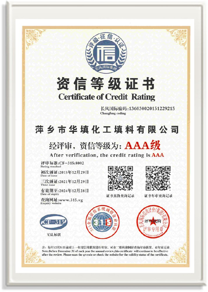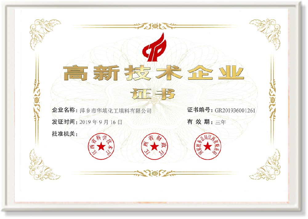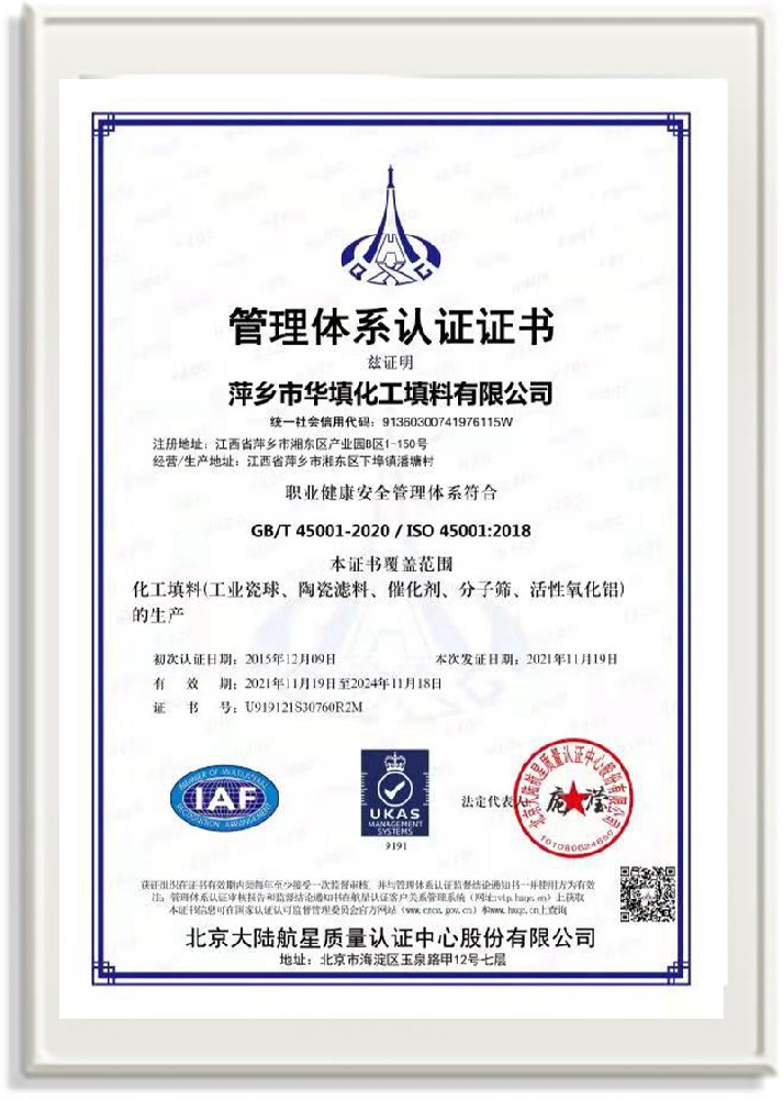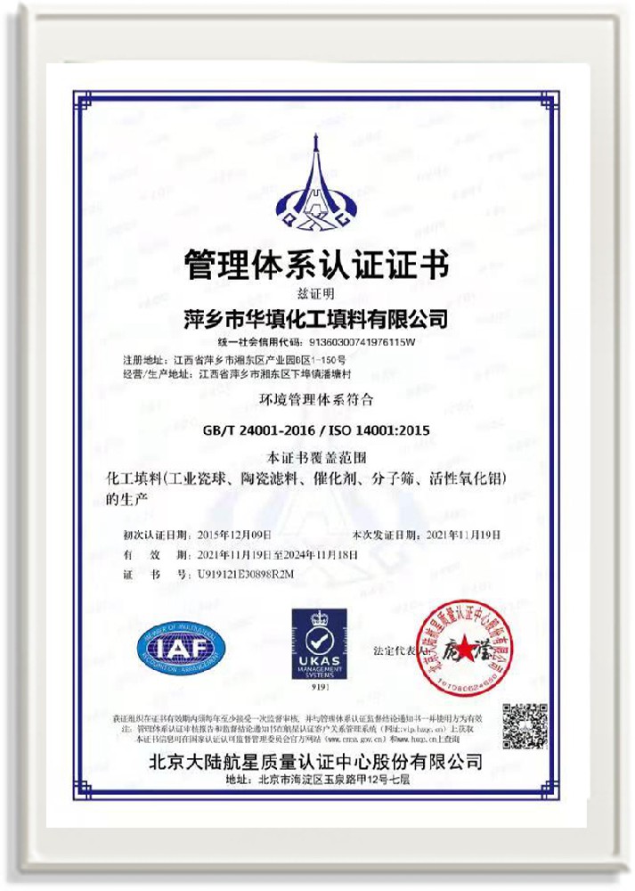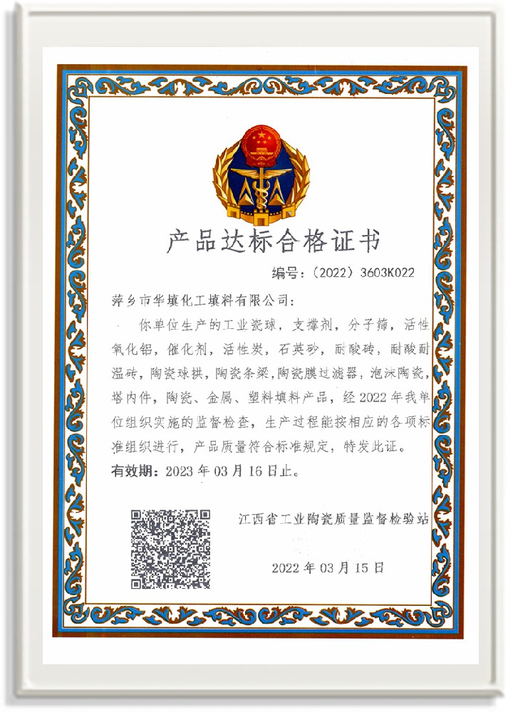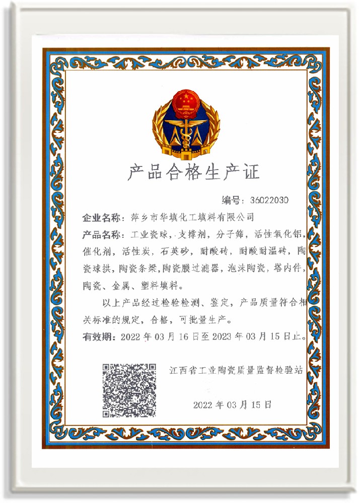 萍鄉市華填化工填料有限公司,位于320國道、109國道、浙贛鐵路、昌金高速公路貫穿其中,交通便利,是江西西部一顆燦爛明珠,創建于20世紀70年代初期,是中國石油天然氣股份有限公司“能源一号網”會員企業、中國石化物資采購電子商務網絡和中國海洋石油總公司采辦業務系統成員單位,是上海大學江西材料基因組工程産業研究院工業陶瓷産業創新聯盟基地,且通過ISO9001:2015質量管理體系、ISO14001:2015環境管理體系、ISO45001:2018職業健康安全管理體系認證的化工填料生産企業。公司擁有陶瓷、塑料、金屬填料、催化劑、活性氧化鋁、分子篩等産品生産線,現有固定資産3616萬元,占地面積3.8萬平方米。公司具有悠久的生産曆史、雄厚的技術力量和先進的生産工藝設備,可生産工業瓷球(支撐劑)、陶瓷、金屬、塑料質的規整、散堆化工填料及分子篩、催化劑、生化濾料、活性氧化鋁、石化助劑、活性炭、環保材料、耐火材料等系列的200多種規格型号産品。